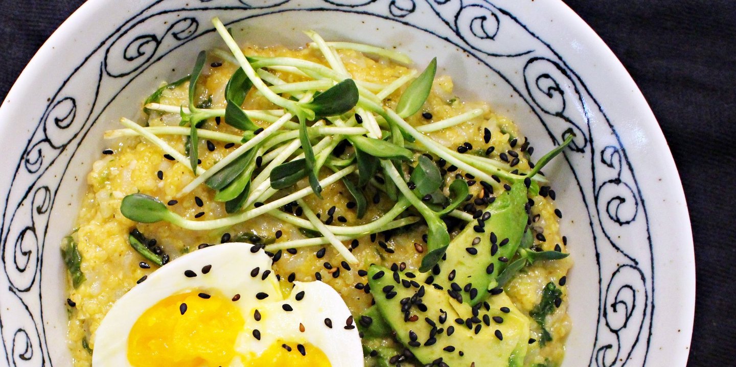 n Traditional Chinese Medicine (TCM), both millet and rice are valued for supporting digestion by strengthening the spleen qi. Millet is especially nourishing because it also replenishes yin, helping the body retain fluids, ease dryness, and cool inflammation. Many common signs of aging are seen in TCM as symptoms of yin deficiency. By nourishing yin through food and lifestyle, we can help slow — and sometimes even soften — the aging process. This spinach and kale risotto takes it a step further: coconut milk, sprouts, avocado, and black sesame seeds all add extra yin-nourishing power to the dish.